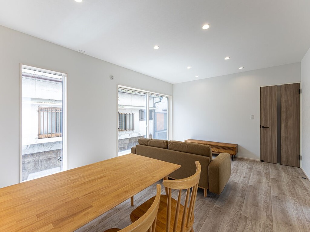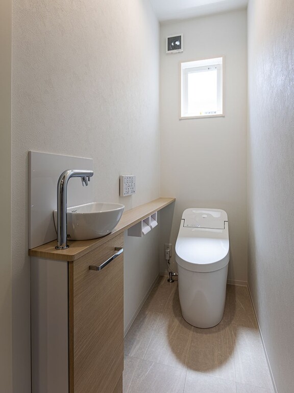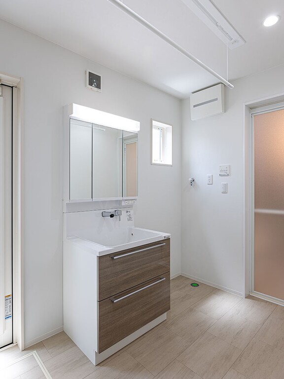 洗面脱衣室には、室内物干しと勝手口を設けて毎日の洗濯がよりスムーズになる動線なのも嬉しいポイントです。