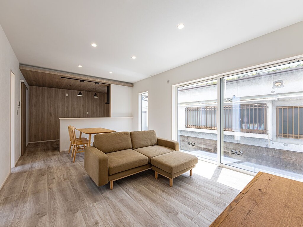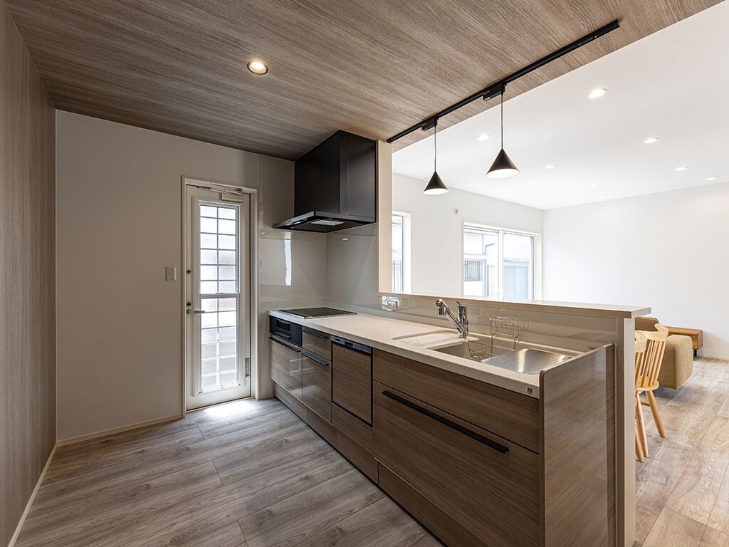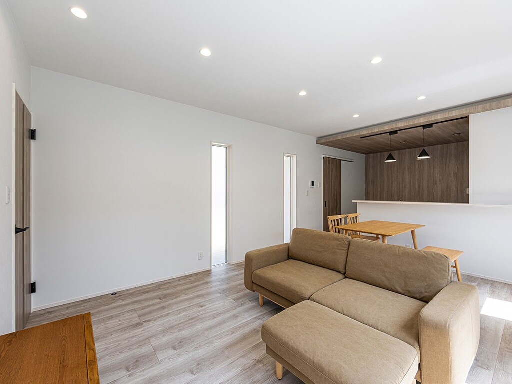 キッチンの折り下げ天井&背面クロスがアクセントのナチュラルなLDK。