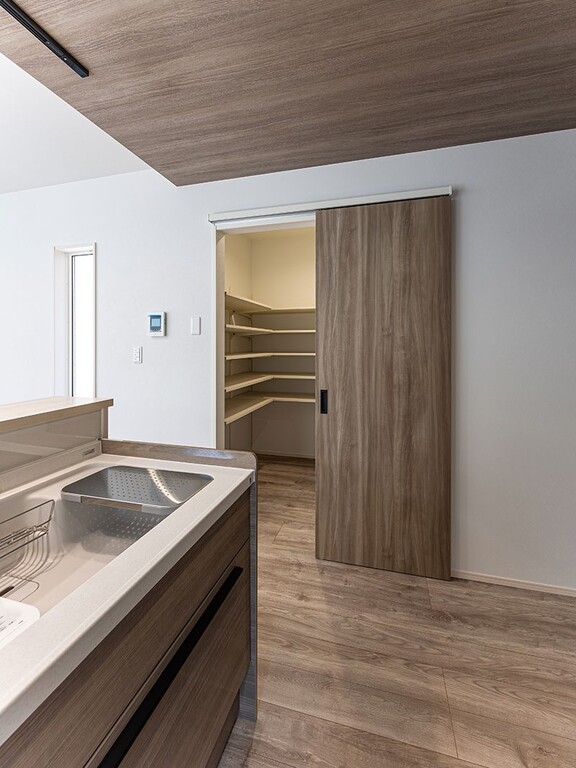 キッチン横にはパントリーを配置し、食品や日用品をまとめてすっきり収納できます◎
